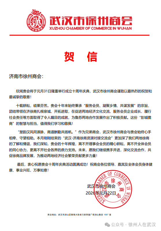 元月31日下午,济南市徐州商会成立十周年庆典在济南金牛诺富特酒店隆重举行,济南、徐州两地工商联主要领导、商会全体会员、济南各异地商会代表、全国异地徐州商会嘉宾及社会各界企业家、文化艺术界人士近500人齐聚一堂,共同见证这一重要时刻,武汉市徐州商会致贺电表示热烈祝贺,并委派执行会长李湧、理事李佰超、执行秘书长曹阿原等出席盛会。